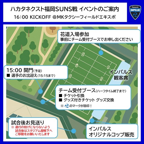 インパルス受付ブースにて集合場所をご案内しますので、キックオフ30分前(15:30)までにお集まりください