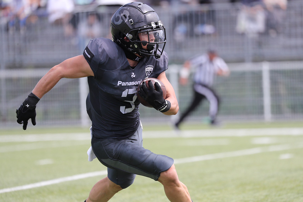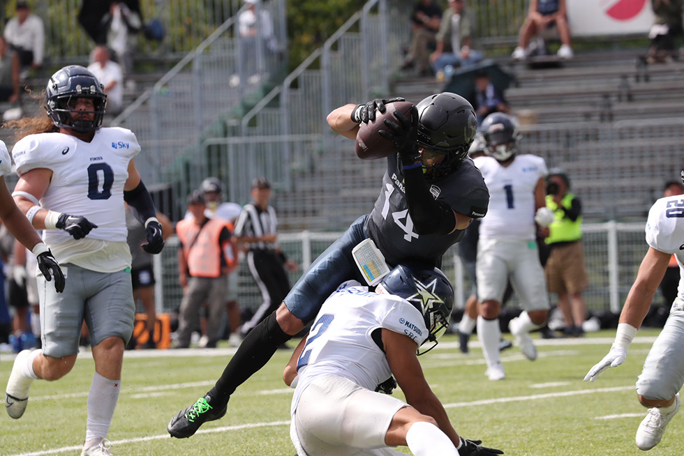 極めつけは前半残り48秒、自陣43ヤードから始まった攻撃だった。インパルスは果敢に得点を狙いQB荒木がWR#14ブレナン翼に35ヤードのロングパスをヒット。一気に得点圏に進み、前半終了14秒前に再びパスを捕球したブレナンがタックラーを飛び越えてTDを決めた。
