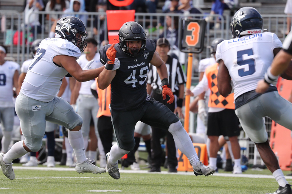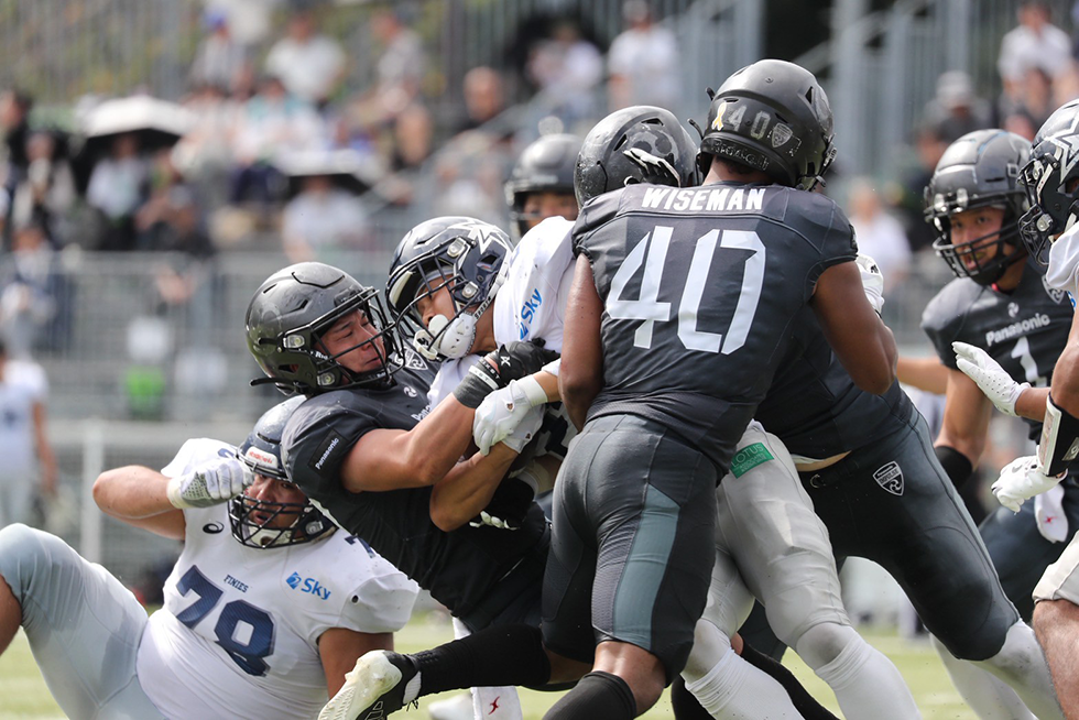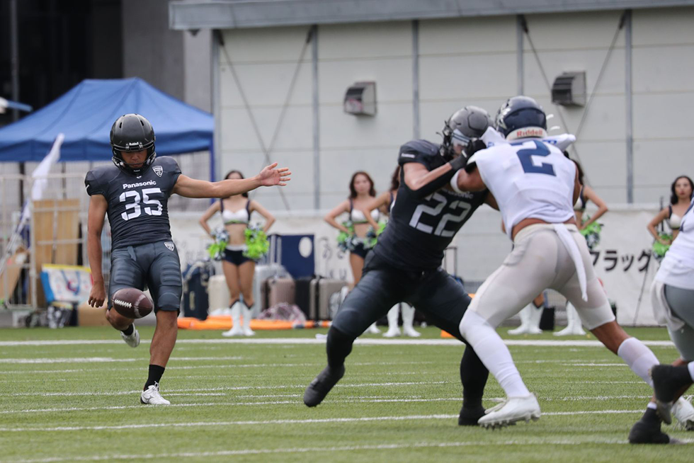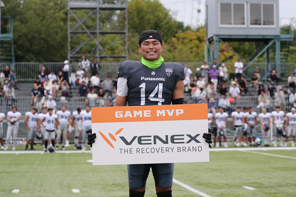 さらに、直後の守備ではエレコム神戸が展開したスペシャルプレーに反応したDL#92有村雄也がボールを奪ってリターンTD。相手の奇襲を返り討ちにしたビッグプレーで、2ポゼッション差を作った。