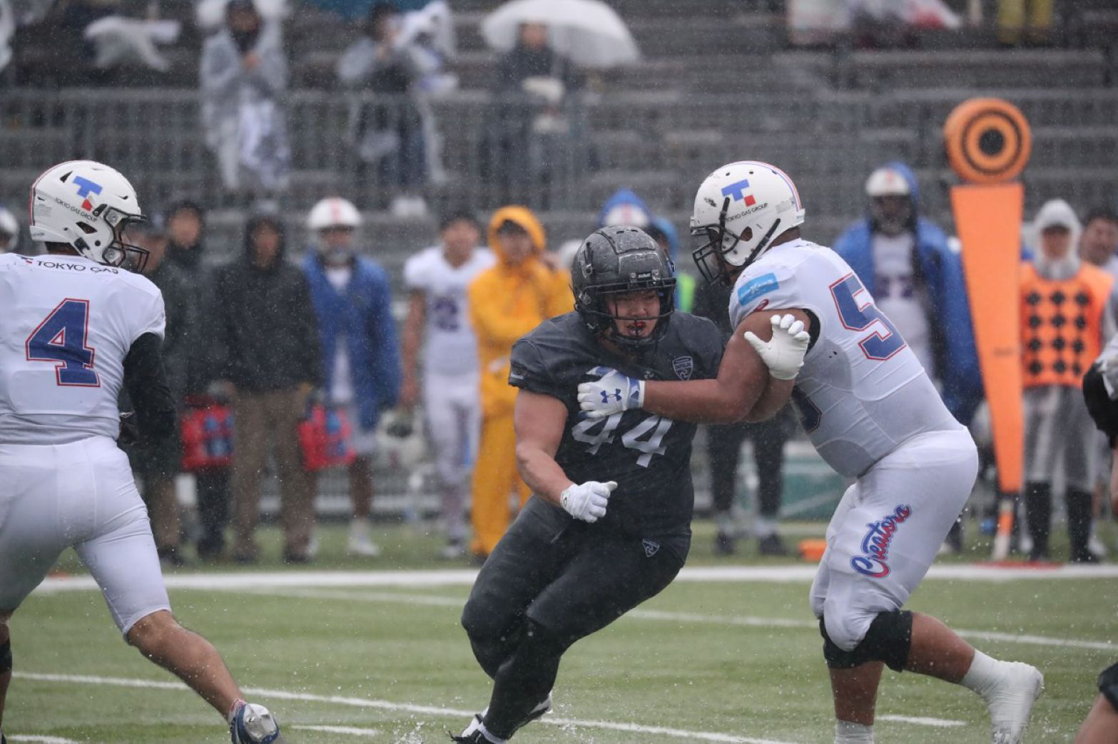 後半、アドバンテージとなったのはOL陣の奮闘だった。C#62眞田祥吾らOL陣が安定したブロックで東京ガスの守備をコントロール。RBミッチェル、#19小泉誠実のランで確実に前進して、8プレー61ヤードのドライブを第3Q5分33秒に小泉の12ヤードTDランで締めくくった。