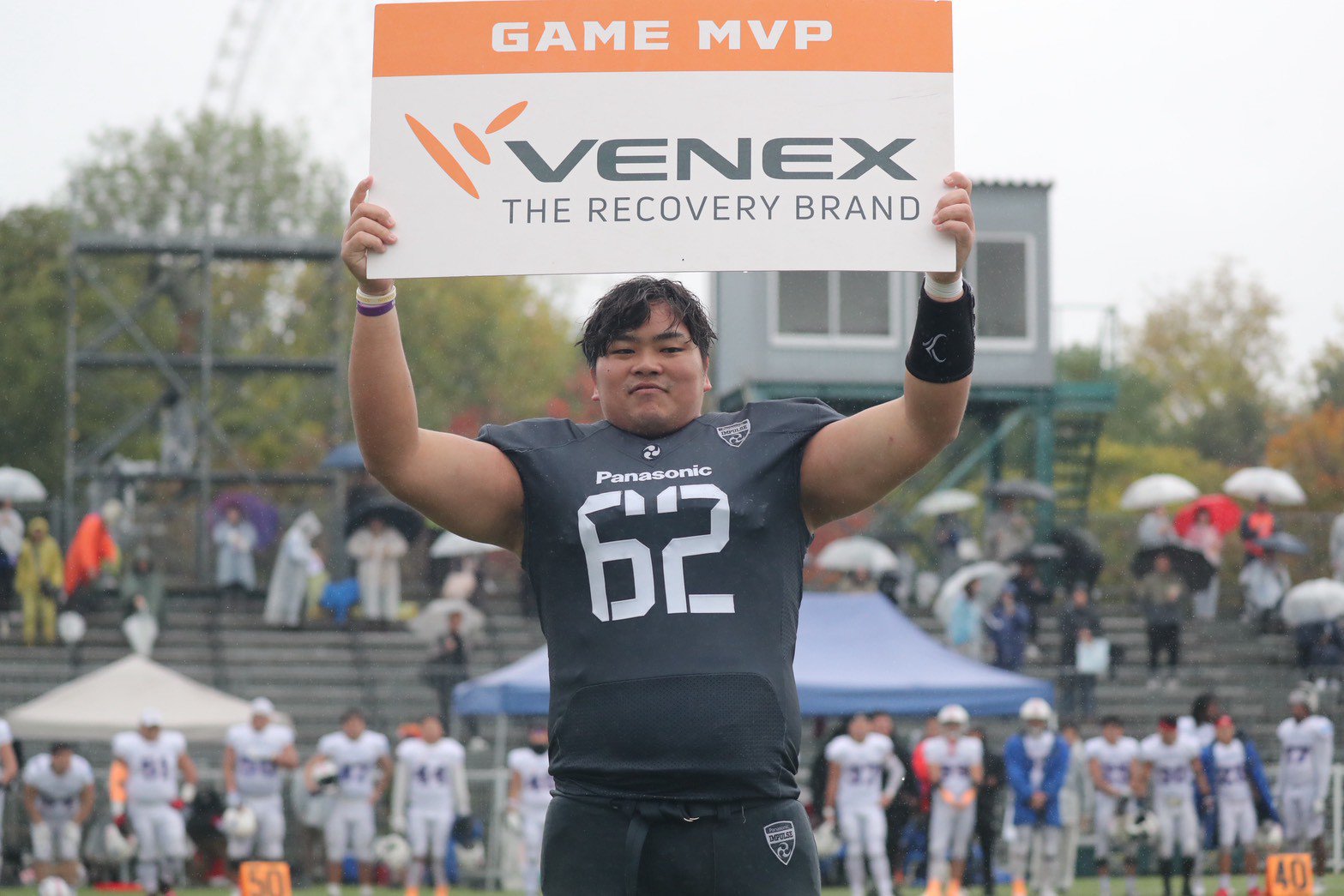 MVPの受賞はびっくりしました。自分としてはいつもどおりプレーしていただけです。ランブロックに関してはよくできましたが、パスプロテクションに課題が残りました。QBサックはされていなくても、プレッシャーがかかっている場面があったので、第3ダウンなどの勝負どころをものにするためには、OLが完璧にブロックをすることが大事なので、そこを課題として立て直していきたいと思います。トーナメントは負けたら終わりなので、OLの真価が問われる戦いだと思っています。いつもどおり、自分の仕事をやりきって、スキルポジションにたくさん走らせ、たくさんパスを捕ってもらえる状況を作れるように頑張ります。