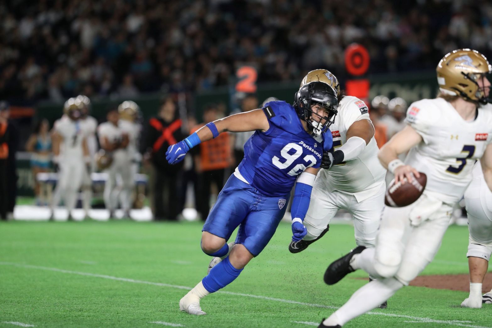 しかし、第2Qはこの歯車が狂い始める。佐伯が2度のFG機会を失敗。第2Q中盤にはオービックにロングパスTDを決められて、3対7と逆転を許してしまう。