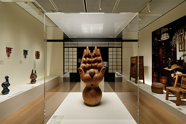 展示は「土」「彫・デザイン」「言葉」、「学んだもの」「コレクション・遺愛品」「資料」で区分し、「土」のコーナーでは中国や朝鮮の古陶磁に倣った初期、民藝運動の影響を受けた用の美の中期、自由な造形世界を繰り広げた後期の三期の作風をご紹介しました。「彫・デザイン」では木彫作品やデザインした家具を紹介し幅広い造形表現をご観覧いただきました。