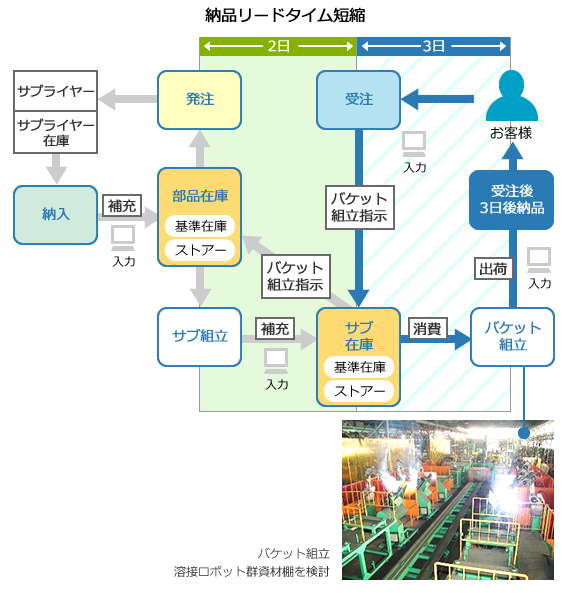 - 個々の部品から途中段階まで加工及び溶接を行ったものを「サブ部品」とし、アイテム毎に最小の在庫を保有することにより、リードタイムを短縮し、受注後3日後納品を実現しました。