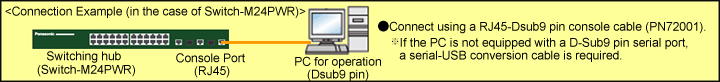 This setting example explains Ethernet Switch Connection Procedure to a Console Port using a terminal emulator software "HyperTerminal", which is pre-installed in Windows. For details on the settings and operation commands, refer to the user manuals on our website or other related instructions.