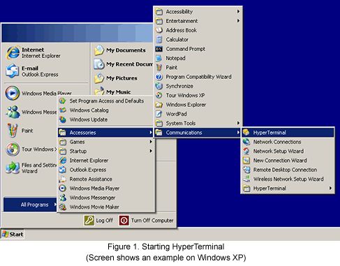 Click the [Start] button on Windows task bar, and select [All Programs] → [Accessories] → [Communications] → [HyperTerminal]. (Refer to Figure 1)
