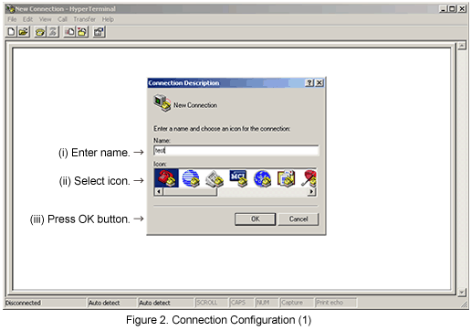 "Connection Description" window appears. Enter an arbitrary name (for example, test), select an icon and click [OK] in the window. (Refer to Figure 2)