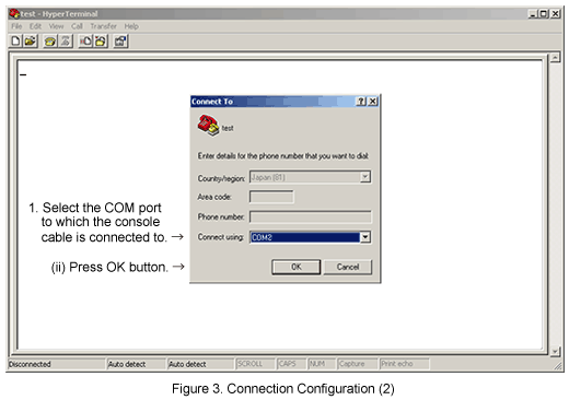 "Connect To" window appears. Click the pull-down menu of the "Connect using" field, select the COM port to which the console cable is connected and click [OK]. (Refer to Figure 3)