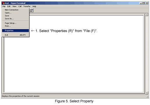 Click [File] in main menu of HyperTerminal and select [Properties]. (Refer to Figure 5)