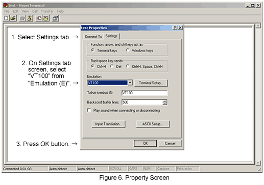 Then, click the "Settings" tab at the upper part of the window to switch the tab, click the pull-down menu of the "Emulation" field, select "VT100" from the list displayed and click [OK]. (Refer to Figure 6)