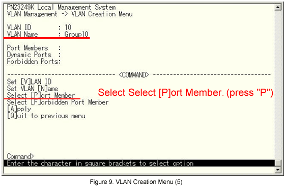 Group10 is entered in VLAN Name. Next, from the screen shown in Fig.9, select the Select [P]ort Member.