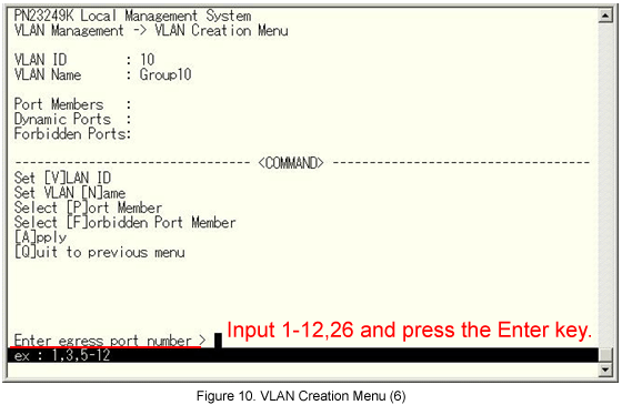 1-12,26 are entered in Port Members. Finally, select [A]pply to complete the VLAN configuration.