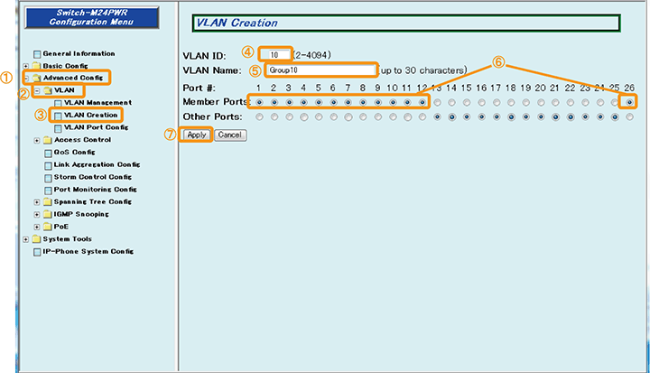 1) Select “Advanced Config” -> ”VLAN” -> ”VLAN Creation”((1) -> (2) -> (3)).