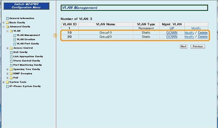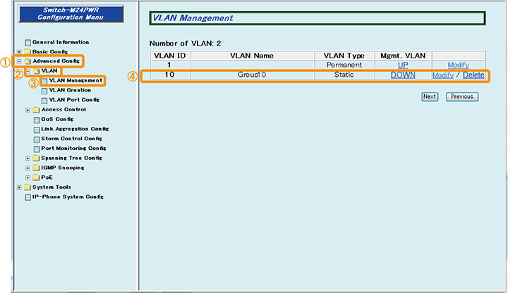 1) Select “Advanced Config” -> ”VLAN” -> ”VLAN Management” ((1) -> (2) -> (3))