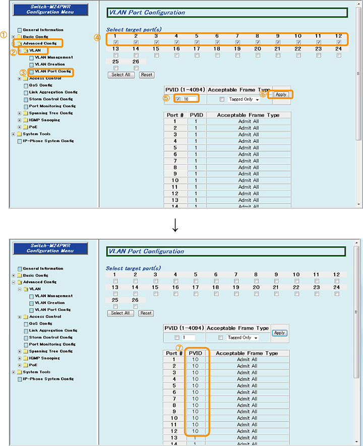 1) Select “Advanced Config” -> ”VLAN” -> ”VLAN Port Config” ((1) -> (2) -> (3)).
