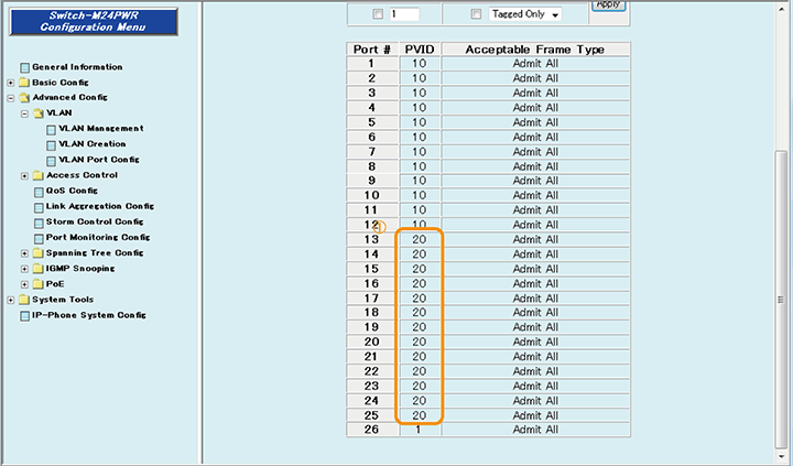 1) By similar procedures, place a check in ”13 to 25” of “Select target port(s)”, enter ”20” in “PVID” and place a check, and select ”Apply” to apply the changes.