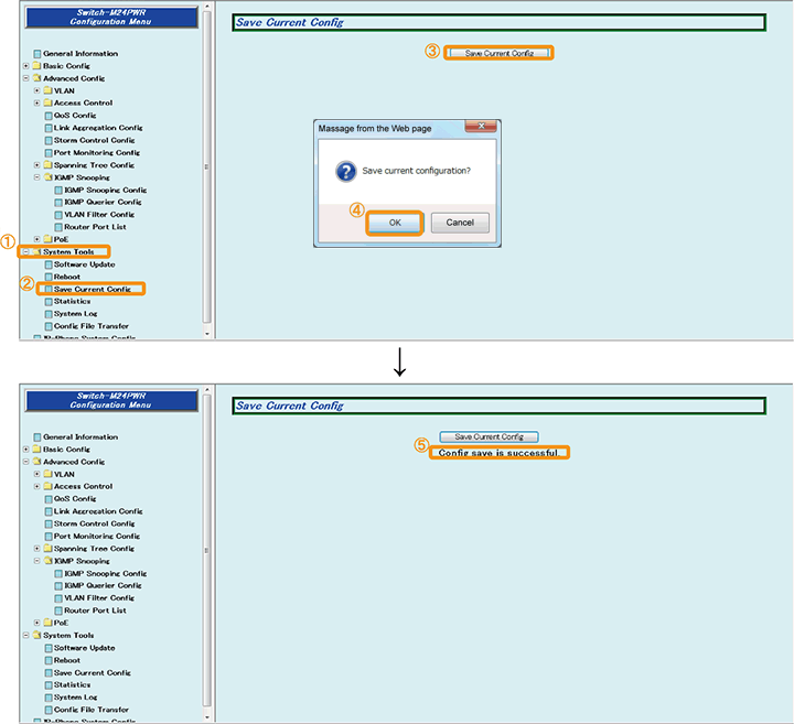 1) Select “System Tools”. -> ”Save Current Config”((1) -> (2)).
