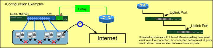 Activating the Internet Mansion function disables ports 1-25 communication with each other and enables only port 26 to communicate with all the other ports. Ports 1-25 are for PC connection. Port 26 is used as the shared uplink (Untag).