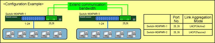 The giga ports are bundled using link aggregation to connect between switches and expand the communication bandwidth (to a maximum of 2Gbps in this setting).