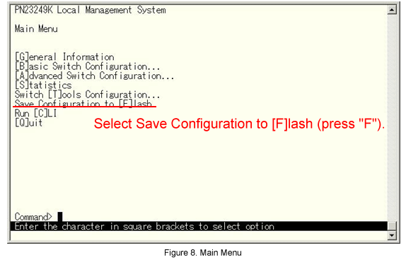 When the Switch-M24PWR-2 setting is completed, return to the Main Menu and select Save Configuration to [F]lash.