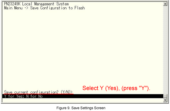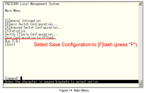 When the Switch-M24PWR-1 setting is completed, return to the Main Menu and select Save Configuration to [F]lash.
