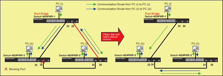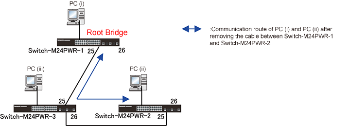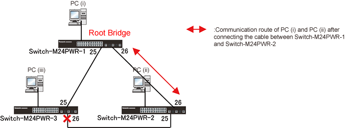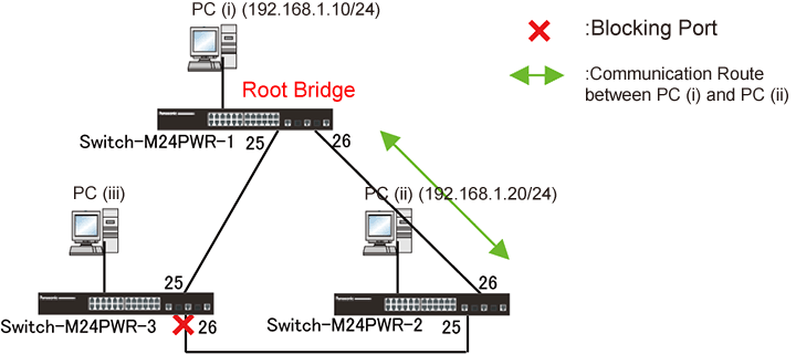 ・Confirm that Port 26 of Switch-M24PWR-3 becomes the blocking port and that the communication path between PC (i) and PC (ii) has been switched.
