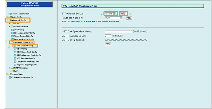 2) Select “Enabled” from the pull down menu of “STP Global Status” (iv).