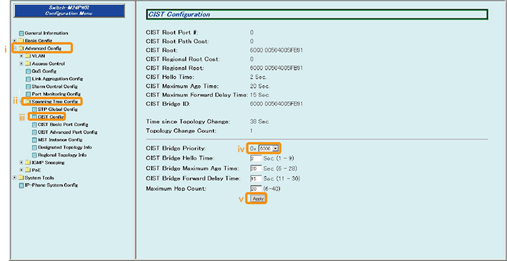 1) Select “Advanced Config” → ”Spanning Tree Config” → ”CIST Config” (i → ii → iii).