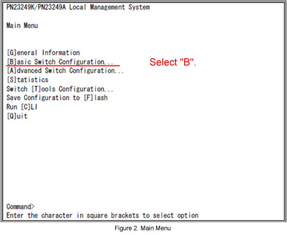 In Main Menu, select [B]asic Switch Configuration. (Refer to Figure 2)