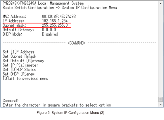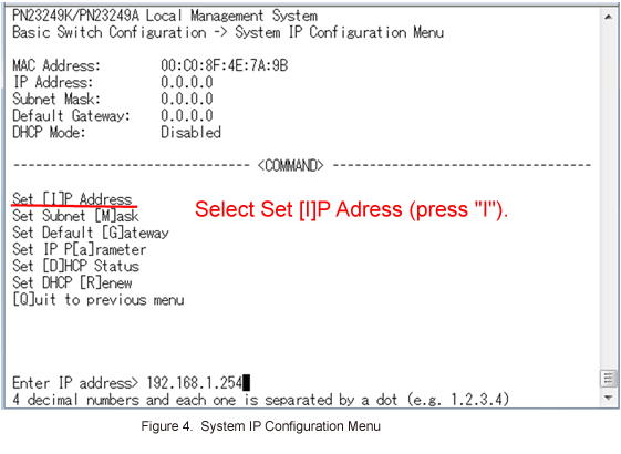 In System IP Configuration Menu, select Set [I]P Address and enter the IP address (192.168.1.254). (Refer to Figure 4)