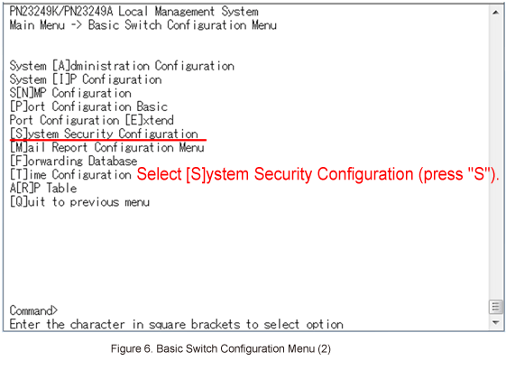 In Basic Switch Configuration Menu, select [S]ystem Security Configuration. (Refer to Figure 6)