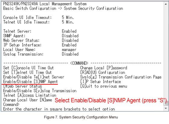 In System Security Configuration, select Enable/Disable [S]NMP Agent to enable SNMP. (Refer to Figure 7)