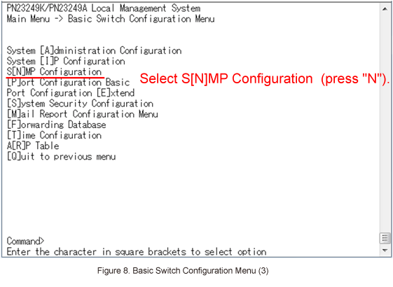 In Basic Switch Configuration Menu, select S[N]MP Configuration. (Refer to Figure 8)