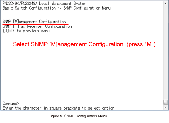 In SNMP Configuration Menu, select SNMP [M]anagement Configuration. (Refer to Figure 9)