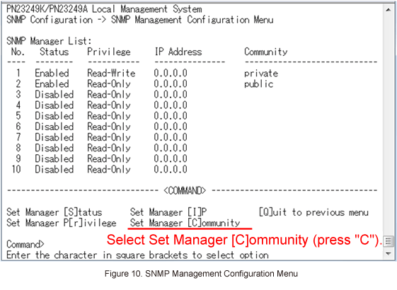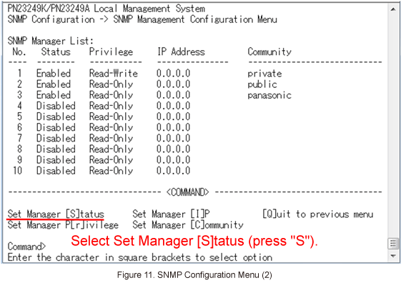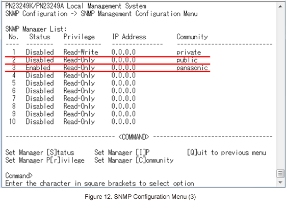 In SNMP Management Configuration Menu, select Set Manager [C]ommunity and register the community name (panasonic) to number 3. (Refer to Figure 10)