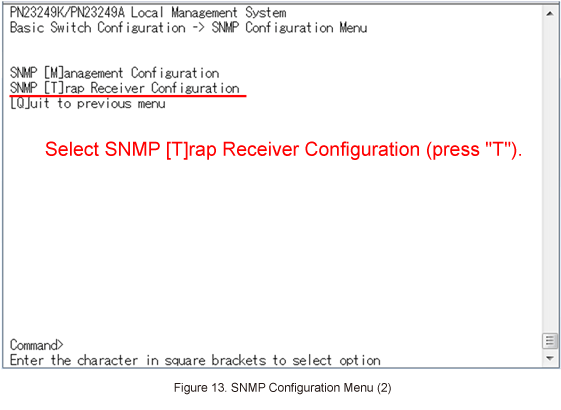 In SNMP Configuration Menu, select SNMP [T]rap Receiver Configuration. (Refer to Figure 13)