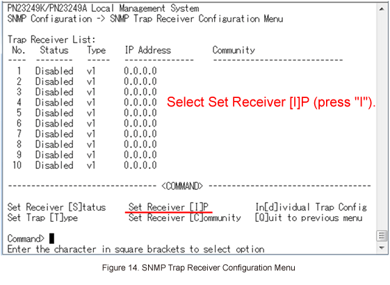 In SNMP Trap Receiver Configuration Menu, select Set Receiver [I]P, and set IP address of the SNMP trap receiver (192.168.1.1) to number 1. (Refer to Figure 14)