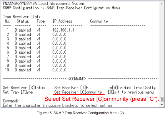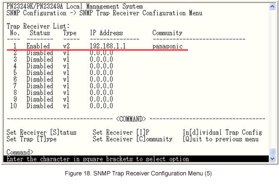 In SNMP Trap Receiver Configuration Menu, select Set Receiver [C]ommunity and set a community name (panasonic) to number 1. (Refer to Figure 15)