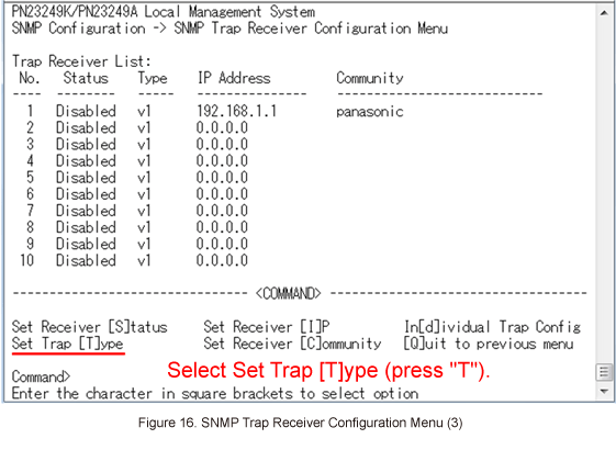 In SNMP Trap Receiver Configuration Menu, select Set Trap [T]ype and select "2" of v2c to set to number 1. (Refer to Figure 16)