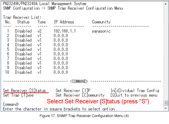 In SNMP Trap Receiver Configuration Menu, select Set Receiver [S]tatus and enable number 1. (Refer to Figure 17)