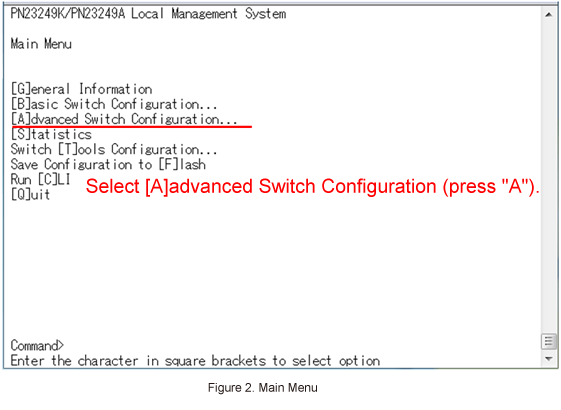 In Main Menu, select [A]dvanced Switch Configuration. (Refer to Figure 2)