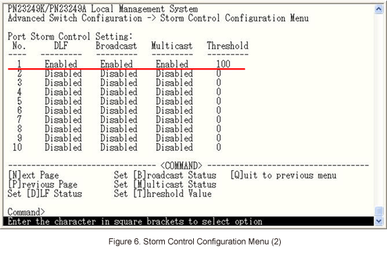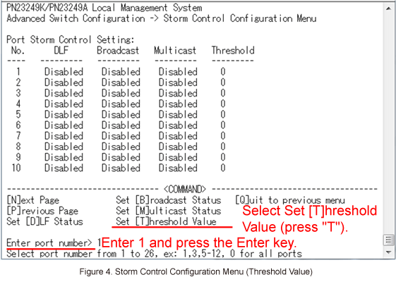 In Storm Control Configuration Menu, select Set [T]hreshold Value and enter port 1. (Refer to Figure 4)