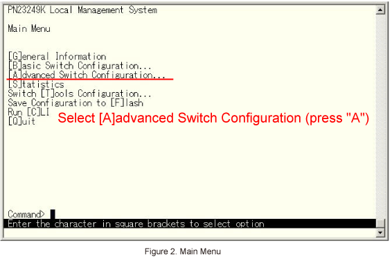 In Main Menu, select [A]dvanced Switch Configuration. (Refer to Figure 2)