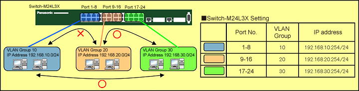 * Communication (Ping, Telnet, etc.) to Ethernet Switches (in the following sample configuration, 192.168.10.254, 192.168.20.254, and 192.168.30.254) cannot be filtered if ACL is configured.