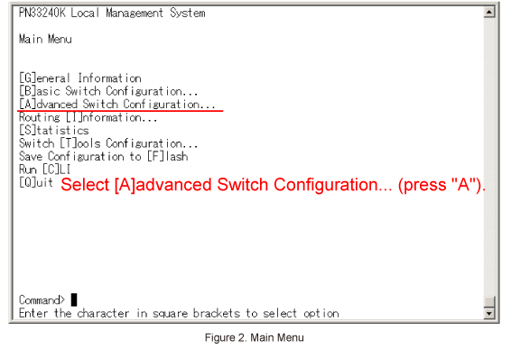 In Main Menu, select [A]dvanced Switch Configuration. (Refer to Figure 2)