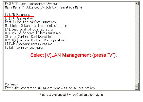 In Advanced Switch Configuration Menu, select [V]LAN Management. (Refer to Figure 3)