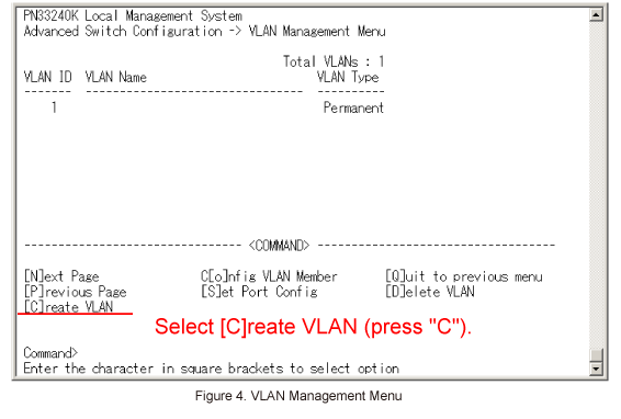In VLAN Management Menu, select [C]reate VLAN. (Refer to Figure 4)