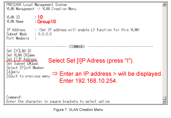 Then, in VLAN Creation Menu, select Set [I]P Address. (Refer to Figure 7)