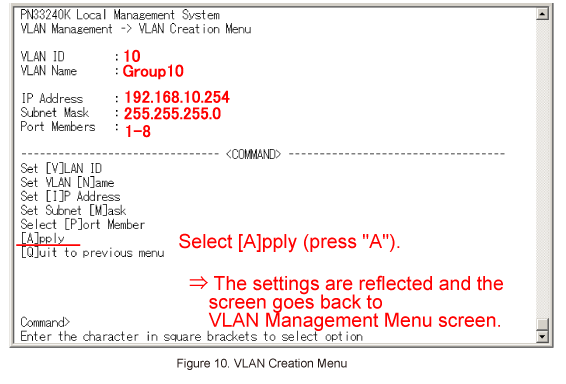 Once all of the items are entered in VLAN Creation Menu, select [A]pply. (Refer to Figure 10)