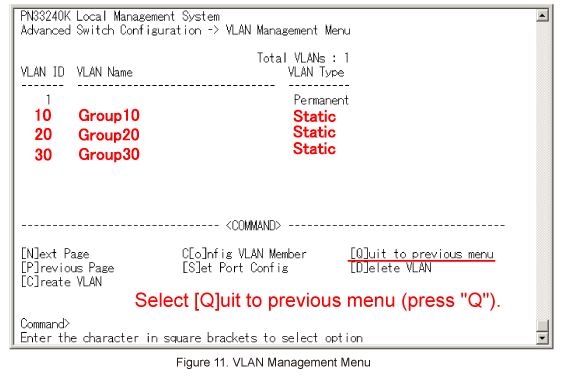 Select [Q]uit to previous menu (press "Q") to go back to Advanced Switch Configuration Menu. (Refer to Figure 11)